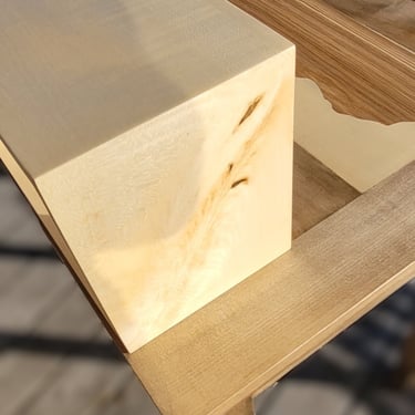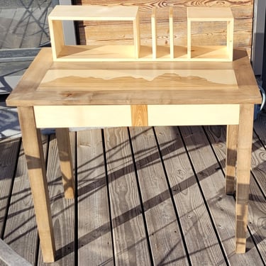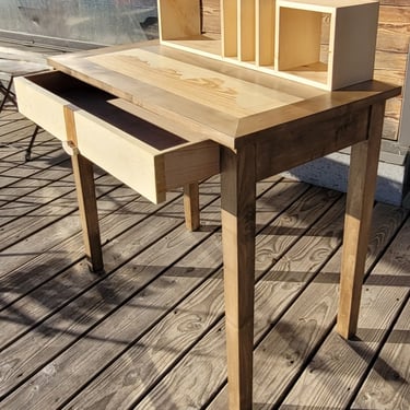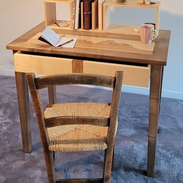 Un petit bureau avec tiroir et étagères posées en hêtre massif